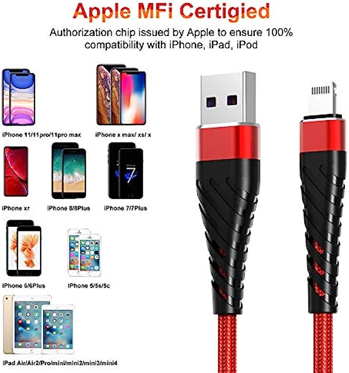 • 【Compatible With】This iphone charging cord 10ft compatible with iPhone 11/11Pro/11Max / X XS Max XR / 8 / 8 Plus / 7 / 7 Plus / 6s Plus / 6s / 6 Plus / 6 / SE / 5s / 5c / 5 / iPad Pro / iPad Air / Air 2 / iPad mini / mini 2 / mini 4 / iPad 4th gen / iPod Touch 5th gen / iPod nano 7th gen.