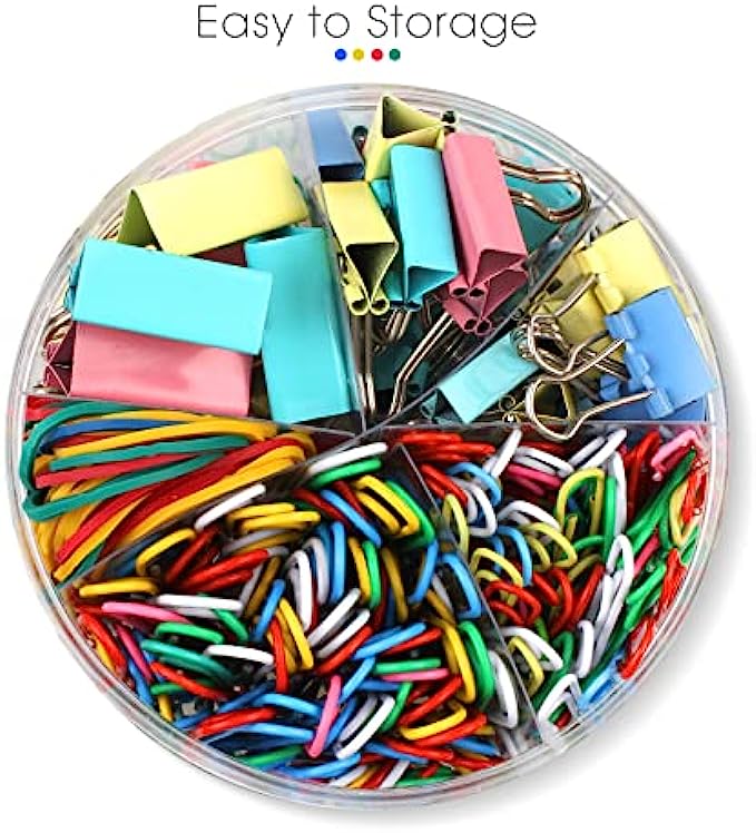 • High cost performance: 50pcs (50mm) and 120pcs (28mm) colour paper clips. 80pcs colour rubber bands. 8pcs (25mm), 12pcs (19mm) and 30pcs (15mm) colour binder clips. They are stored in different grids in reusable plastic containers for easy to find or storage.