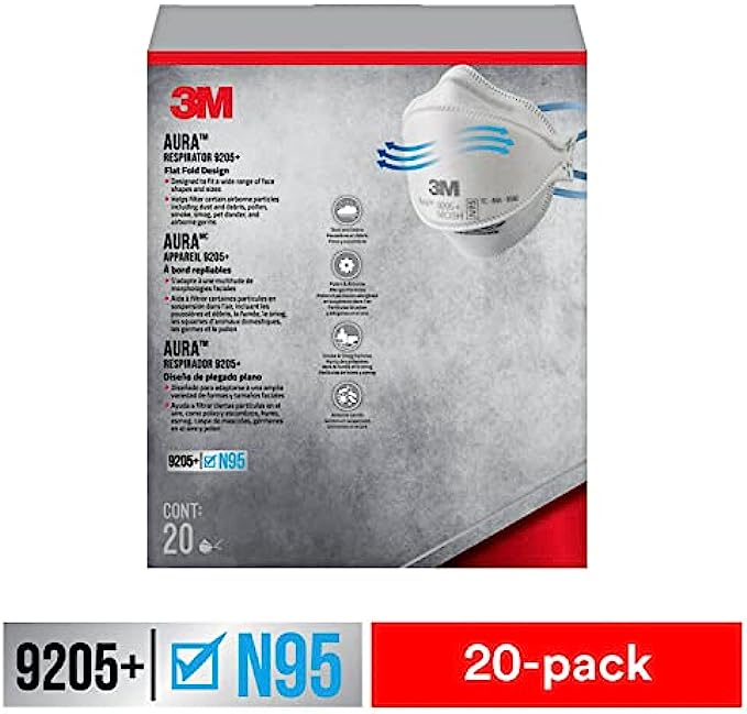 3M Aura Particulate Respirator 9205+ N95, Lightweight, Three Panel Designed Respirator Helps Provide Comfortable And Convenient Respiratory Protection, 20-Pack