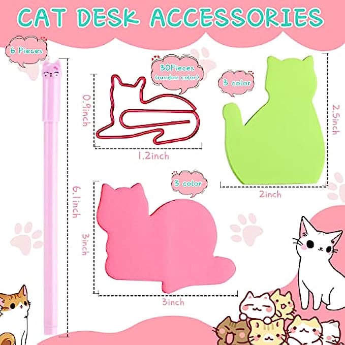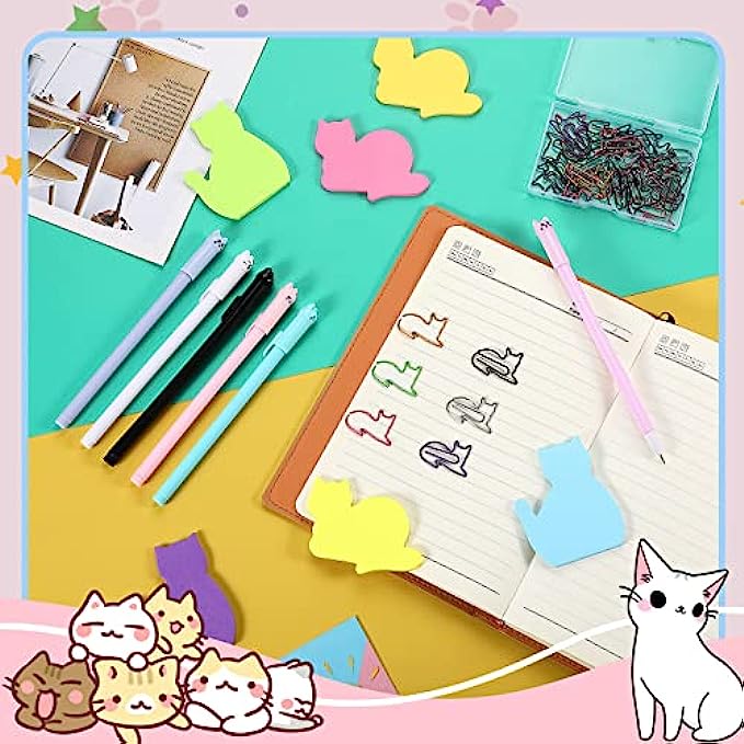 42 Pcs Stationery Set 6 Color Cute Sticky Notes 30 Pcs Paper Clips and 6 Pcs Cute Pen Lover Gifts Lovely Office Desk Accessories for Work School Office Supplies(Cute Cat)