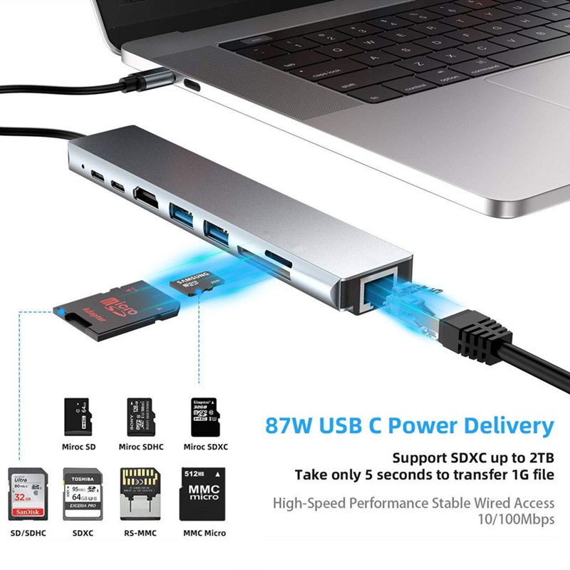 8-IN-1 USB C HUB Type C To HDMI Adapter Type-c To USB 3.0 RJ45 Ethernet Micro SD Card Reader USB C 3.1 Data Transfer 87W PD Charging Multi Port HUB Type C Docking Station