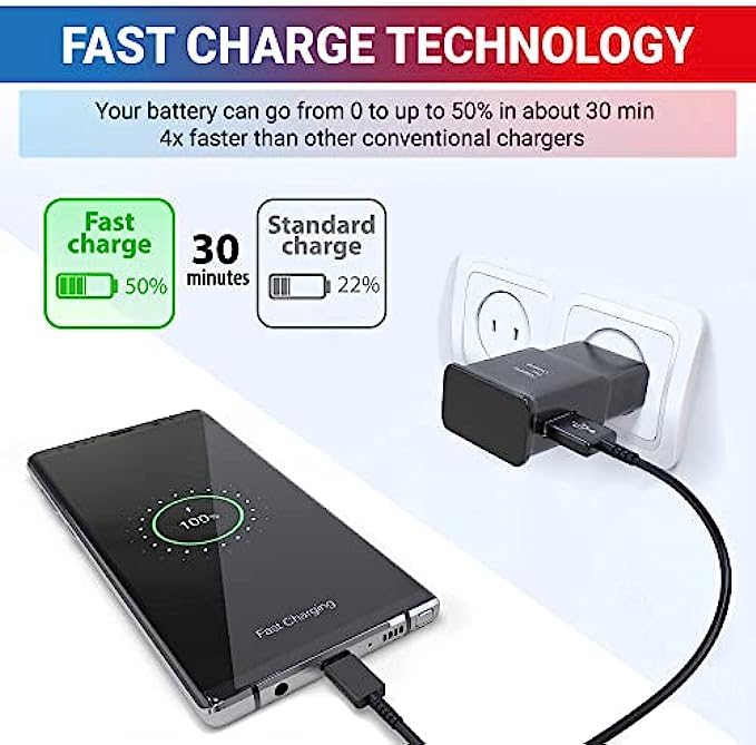 Adaptive Fast Charger Kit with USB Type C Cable 6.6ft Compatible with Samsung Galaxy S8/S8 Plus/S9/S10/S10 Plus/S10E/ S20/S20 Plus/S21/S21 Ultra/S22/Note 8/Note 9/Note 10/Note 20 2-Pack