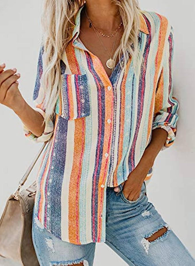 • Features: Button down, V neck, Stripes, Color Block,Cuffed Sleeve