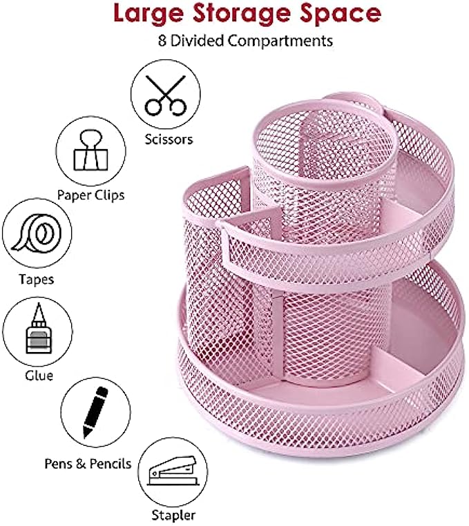 【360 DEGREE REVOLVING DESIGN】 This desktop organizer can be turned up to 360 degree rotation to the left and right .You can easily reach out to something useful and practical you need during working or studying.The product can be bilaterally and smoothly rotated, just turn as you please.