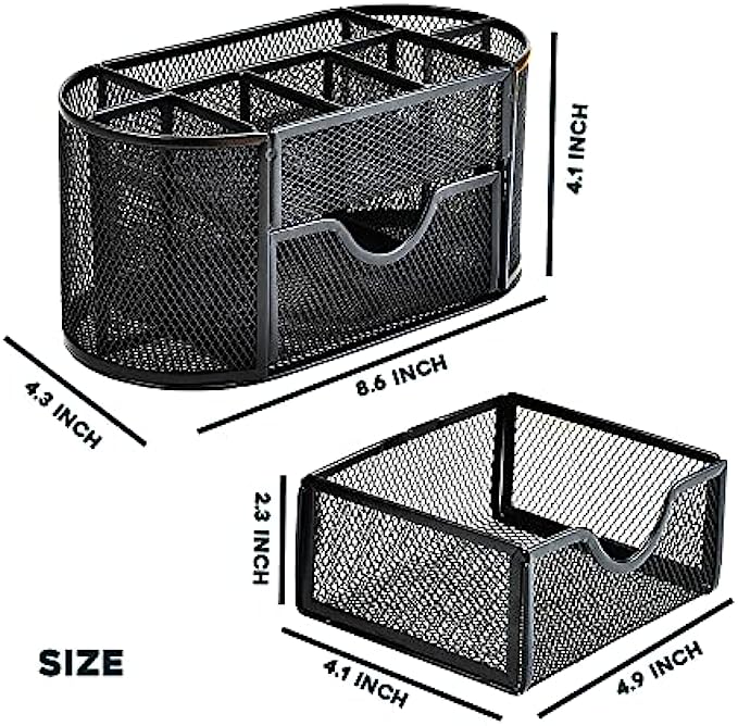 • Product Dimensions- This organizer has 8 compartments and a drawer allowing storage of almost anything office supplies! The exact dimensions are 8.6x4.3x4.1 Inches.