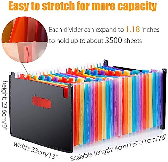 Large 24 Pockets File Folders: TriMigic file box will give you plenty of room to grow and add more things as needed, because this accordian file organizer has 24 individual pockets that fit A4 & letter size, and each pocket can expand across the bottom and top, the accordion file organizer can hold up to about 3500 sheets