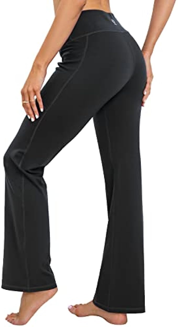 73% polyester 27% spandex ULTRA-SOFT MATERIAL: Bootcut workout pants(Upgrade) for women are made from materials with 73% Polyester & 27% Spandex premium butter. Super stretchy and soft, large proportion polyester retains its shape and is very durable, easily washed & dried. HIGH WAIST & TUMMY CONTROL: Yoga pants a High-Rise Waistband with Tummy Control design, it won't roll down even you do a wide range of movement, 4-way Stretch material that promotes both compression and support. Sweat-wicking, Non-See-Through and make streamlined look. Perfect womens dress pants. FUNCTIONAL THREE POCKETS: The bootleg pants with 2 side pockets & 1 waistband pockets are ideal for keeping your cards, keys, etc. while you're on the yoga or working out at any places. 2 side deep pockets can fit a large smart phone can let you move, squat or do any poses in your exercises. UNIQUE DESIGN: Design your own work pants that suit you best, whether you’re tall or petite, slim or plus-size or anyother. You can alter these yoga pants to your preferred inseam length all on your own; find two symmetrical marks at the bottom of the flare pants and trim. Don't worry, they won't lose their bootcut shape in the process. VERSATILE SCENES: If you're looking for even more cozy pieces for your closet, workout pants would be your Best Choice either for work, casual or daily wear, yoga pants for women can be matched from high heels to flat shoes, from office to yoga classroom, so that both your work, life and exercise can be connected seamlessly.