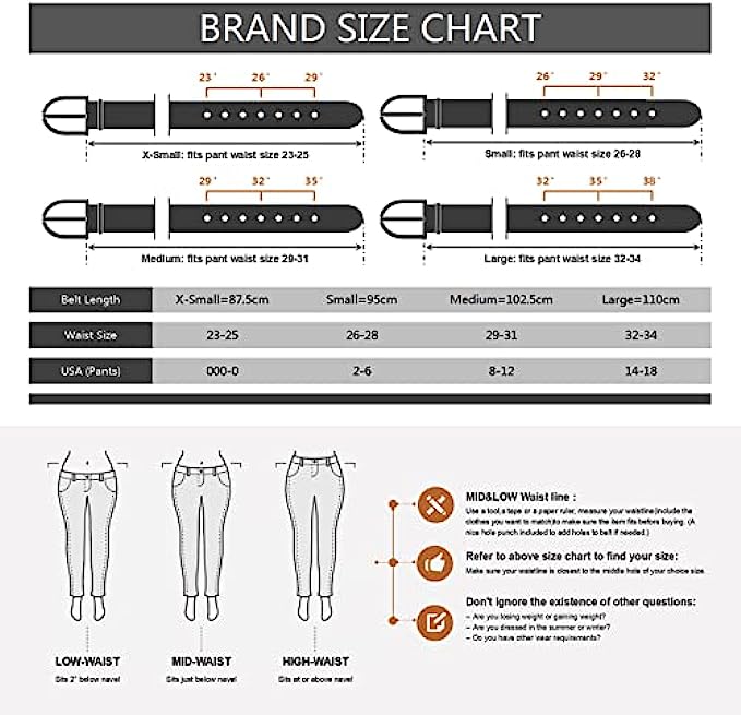 100% Faux Leather Imported Pin Buckle closure Dry Cloth Clean [ Faux Leather Jeans Belts ] Made out of the smooth leather-like material that provides you with a soft touch. It also features a single-prong buckle in metallic finish. For best care, spot clean only [ Belts Size ] Womens belt in XS/S/M/L size, belt wide 1 1/10", please measure your waistline(include the clothes you want to match)to make sure the item fits before buying (Our size chart is different from Amazon, please check it more careful) [ All-Match On Trend Style] From timeless black to brown beige or white with gold buckle this belt has the look to match with any of your daily outfits, adjust it to your preference to wear on waist or hips