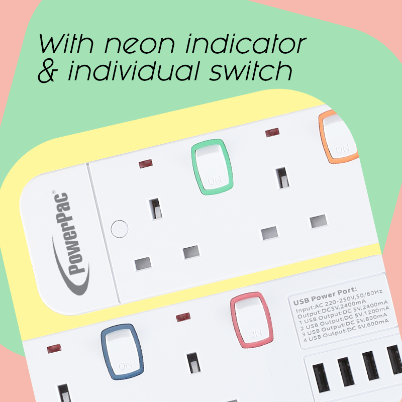 PowerPac Power Extension Socket Extension Cord 3/4/5/6 way 3 meter with 4x USB Charger (PP9113U to PP9116U)