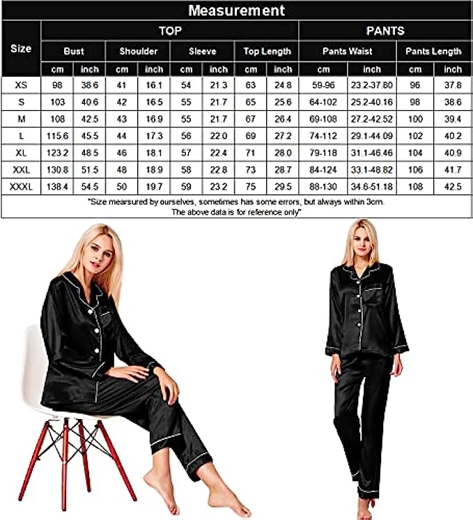 Button closure Machine Wash Materials: This lightweight pajama set is made of lightweigh silk satin, soft,breathable and skin-friendly, help you have a sound sleep. Features: The relaxed fit two-piece comfortable sleepwear pajama set features the silkiest pant with elastic waist and matches a silky-smooth long-sleeve V-neck top with a chest pocket, notch collar and the button-front top hits at hips. The sleepwear set are soft and elegant, to giving you a lazy sleep. Occasion: Women's Long Sleeve Silk Satin Pajamas Set, which is suitable for daily wearing and easy to match. Comfortable and suitable for lounging and sleeping, pajama party, girls day, bridal sleepwear, indoor, living room, bedroom, hotel, vacation, travel, and daily sleepwear. Gift: Women's silk pajamas for women is made of high quality imitation silk fabric, it is soft and natural shiny. Great Choice For your Wife, Girlfriend, Mother, Sister and Doughter as a Birthday gift and Great Present for New Year, Valentine's Day, Christmas Day, Bridal Party Gifts, Honeymoon Vacation or other Festivals or Anniversaries. Washing Tips: Machine Washable, Hand Washed Suggestion.