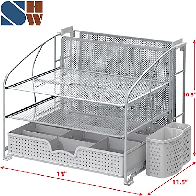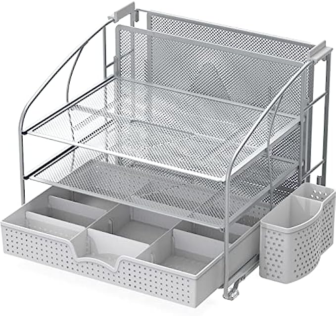 SimpleHouseware Desk Organizer 3 Tray w/Sliding Drawer, Hanging File Holder and Pen Holder Accessory, Silver