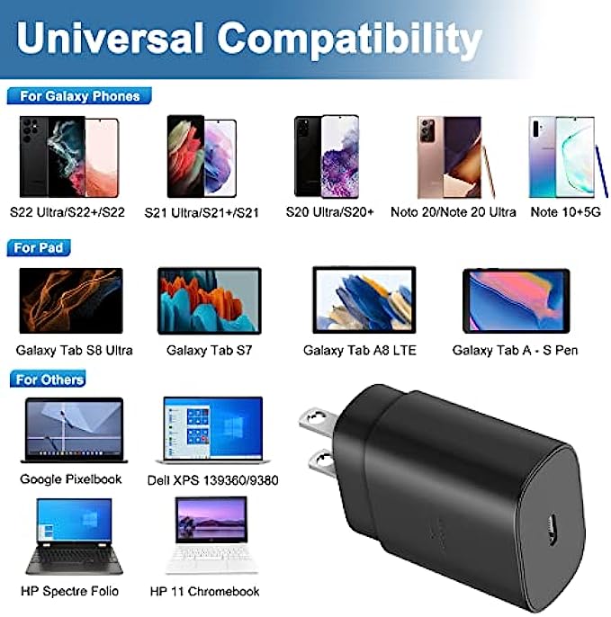 • 25W Samsung Super Fast Charger: Equipped with an USB Type C port, the Power Delivery 3.0 USB C wall charger provides you Max 25W output power. You can charge your deivce back to full power in no time by using the 25W USB C charger for Samsung galaxy S22, S22 Ultra, S22+, S22 Plus, z fold3 5G, z flip 3, S21, S21 Ultra, S21 Plus, Note 10 and more. You can charge your Phone to 60% in just half an hour, 5 times as fast as standard USB C wall charger.