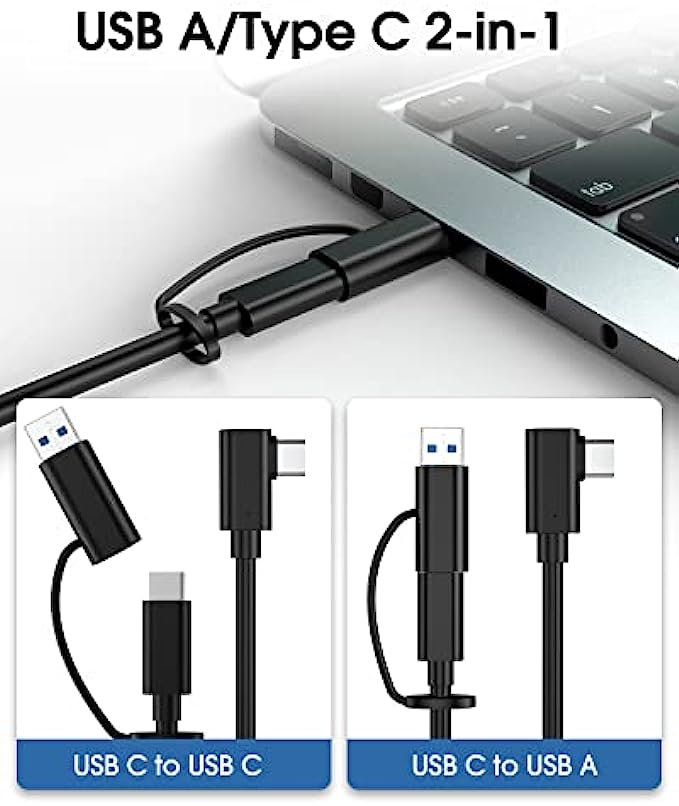 • High-Speed Data Transfer: Oculus Quest 2/1 link cable provides up to 5Gb per second transfer speed. The smart chip's quick and stable data synchronization and continuous current bring you the highest rendering quality of your PC and a smooth gaming experience. An additional USB-A port enables compatibility with older PCs as well.