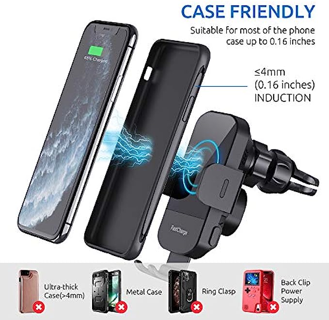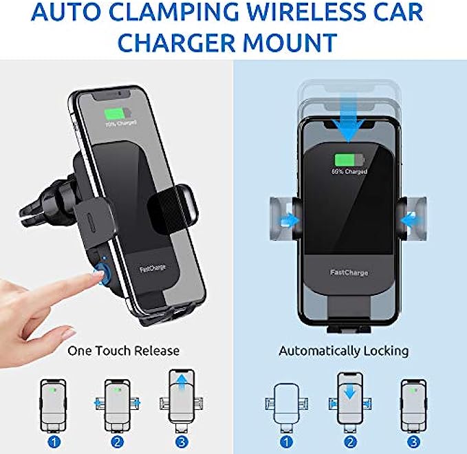 • 【INTELLIGENT IDENTIFICATION & SMART CHARGING】When connecting to the cable, the phone car mount will automatically clamp when phone is dropped in, make your driving easier and safer. A gentle touch on the 2 sides button of the charger can make the arms open. When your phone is fully charged, the wireless car phone charger will automatically power off and protect the battery of your phone