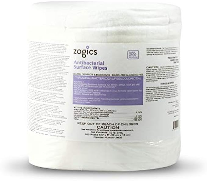 EPA DISINFECTANT WIPES: Zogics EPA-registered disinfecting surface wipes are created with a powerful antibacterial formula to kill 99.9% of germs, of germs, viruses, and bacteria in just 15 seconds, and is effective against H1N1, MRSA, Flu, Strep, Salmonella, HIV-1, E coli, VISA and VRE, and many more. MULTI-SURFACE USE: Our anti-bacterial wipe is the ultimate tool to thoroughly clean and disinfect a variety of surfaces, including countertops, door handles, gym equipment, and plenty of other hard, nonporous surfaces. These surface disinfectant wipes are strong and made with durable fibers; they get the job done and leave behind a crisp, fresh scent. SAFE AND EFFECTIVE: Our wet wipes are saturated the perfect amount with our unique formula that is made without the use of bleach, alcohol, and phenol while still being highly effective at cleaning and sanitizing a space. LARGE, DISINFECTING WIPES BULK: Zogics surface sanitizing wipes are large wipes made from durable fibers. Each bulk wipe rolls fit most standard dispensers, making them a necessary cleaning tool for everything from gyms to nursing homes, hospitals, schools, and offices. PROFESSIONAL, AFFORDABLE SANITIZING SOLUTIONS: Zogics was created with our customers in mind. Our entire catalog of cleaning products focuses on bringing the highest quality, professional products at affordable prices to industries ranging from fitness and health to government to hospitality.
