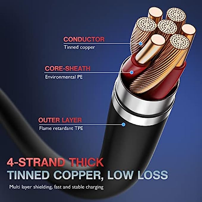 • [ TPE Coated Outer layer Craft ] - TPE material is environment-friendly, safe, non-toxic and soft to touch. It also has good weather-resistance and temperature resistance. It's more flexible than nylon braided cable. And it has high resilience, so it won't knot easily.