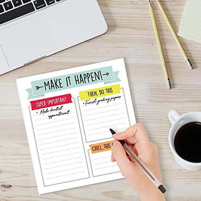 What’s Included: 50 lined pages are included with 3 organized sections: “Super Important”, “Then, Do This”, and “Chill, This Can Wait” to organize your needs by priority. A “Make It Happen!” inspirational quote is featured at the top of each page