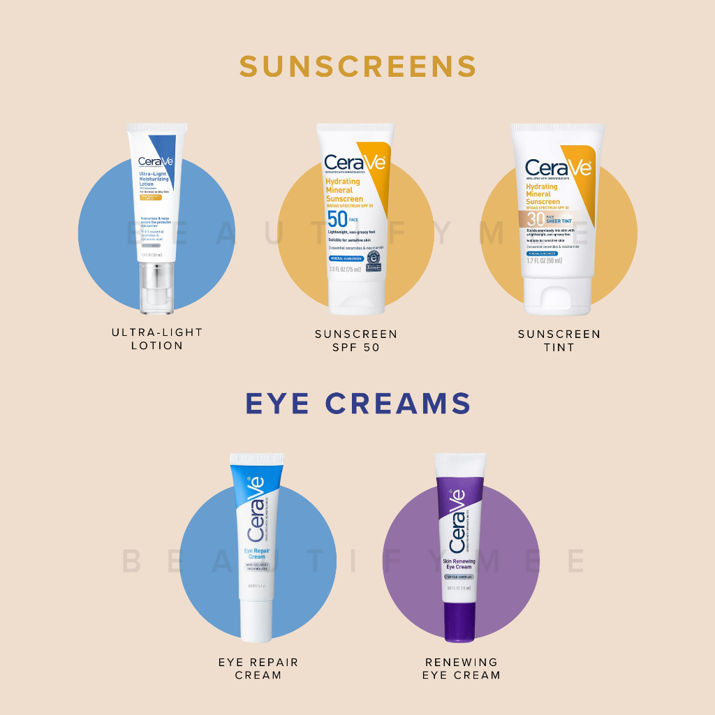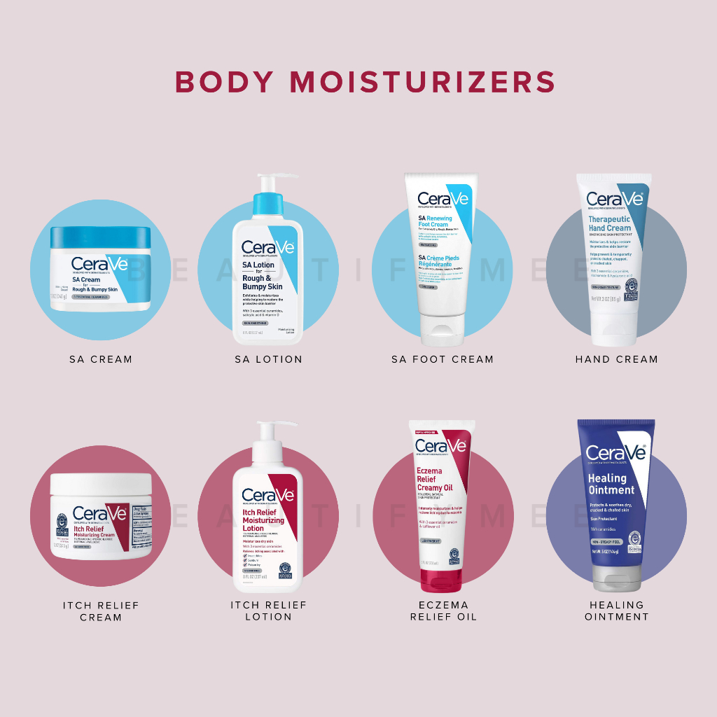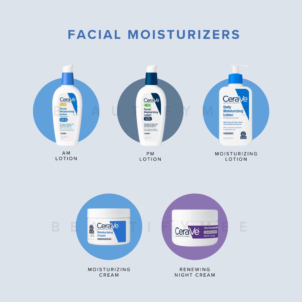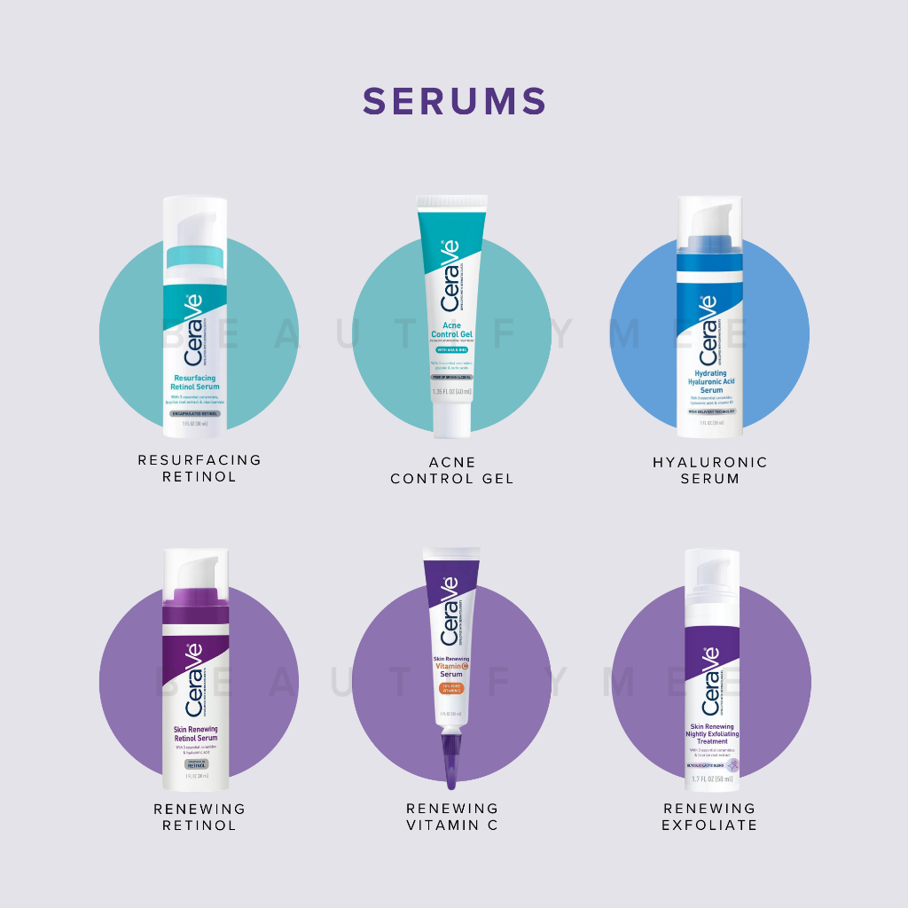 CeraVe Cleanser (Hydrating, Foaming, Renewing SA), Lotion (Daily, AM, PM), Moisturizing Cream, Resurfacing Retinol
