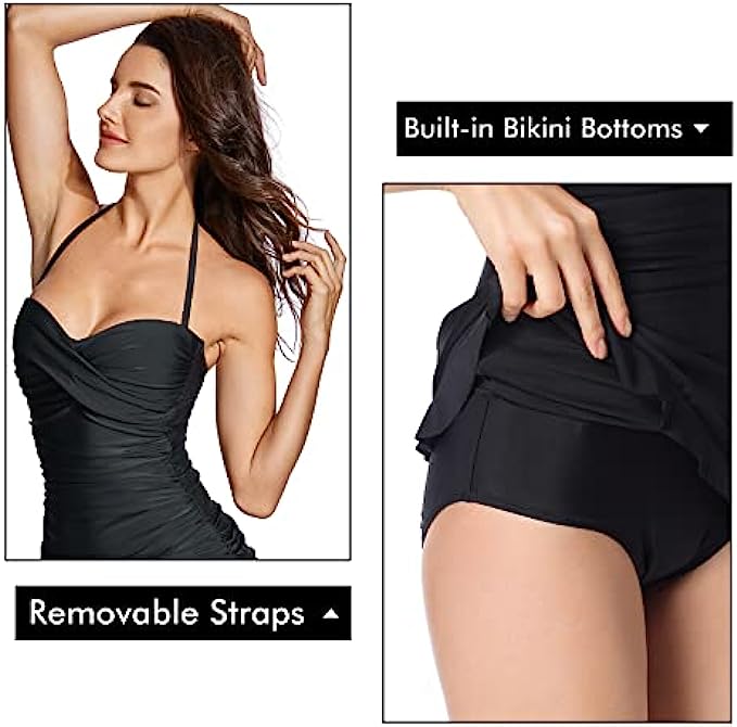 DOBREVA Women's Vintage One Piece Strapless Bathing Suit Tummy Control Skirt Retro Swimsuit Swimdress