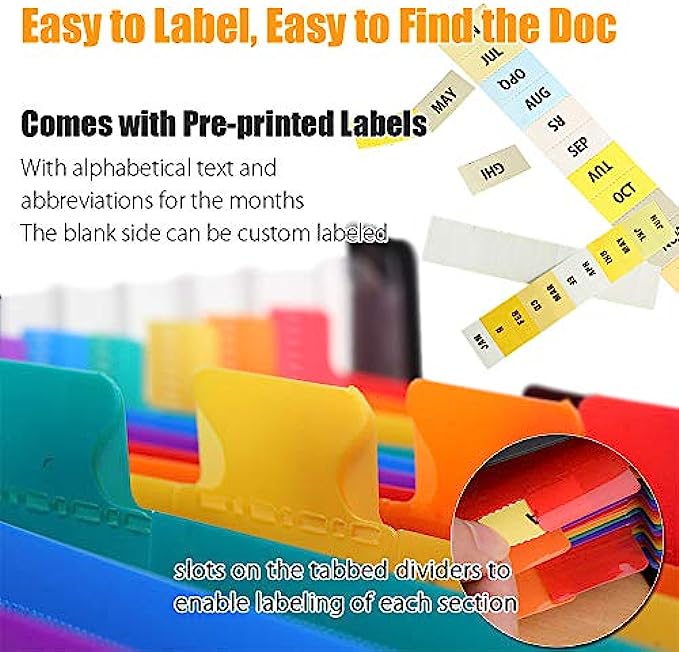 Colorful Expanding File Folder: the multi-color plastic label reveals both the document and the label tab, making all your files simple to retrieve. Include Pre-printed labels with alphabetical ABC and the months, and also can be custom labeled