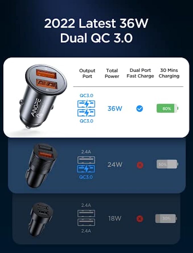Fast Car Charger Fast Charge AINOPE USB Car Charger Adapter 36W All Metal Mini Cigarette Lighter USB Charger Quick Charge Compatible with iPhone 13/12/11 pro/11/ x/8, Note 9/Galaxy S10/S9