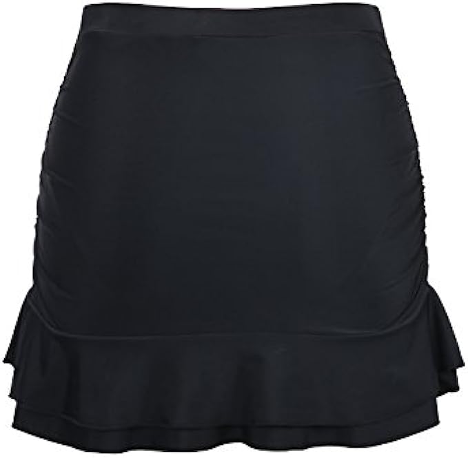 80% Nylon, 20% Spandex Imported OUR SIZE SUGGESTION:The Swim Skirt fits true to size now, please refer to the size you normally wear. For example:If you are US 4, please order size 4, you will receive the swim skirt Tag US 8 which fit for US 4 (We make the adjustment). Swim skirt features built in swim pants and an elastic waistline for a flattering fit. Ruched front design and flat in back, so it can slim your tummy and flatter feminine curves. High waisted swim skirt for concealing tummy better; Double ruffle hemline. Built-in mesh brief increases comfort and support.