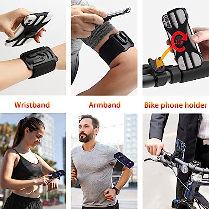 • 3 in 1 running phone wrist strap & bicycle phone mount. The sports armband for men and women has 3 functional applications, you can use it on your arm, wrist and cycling.