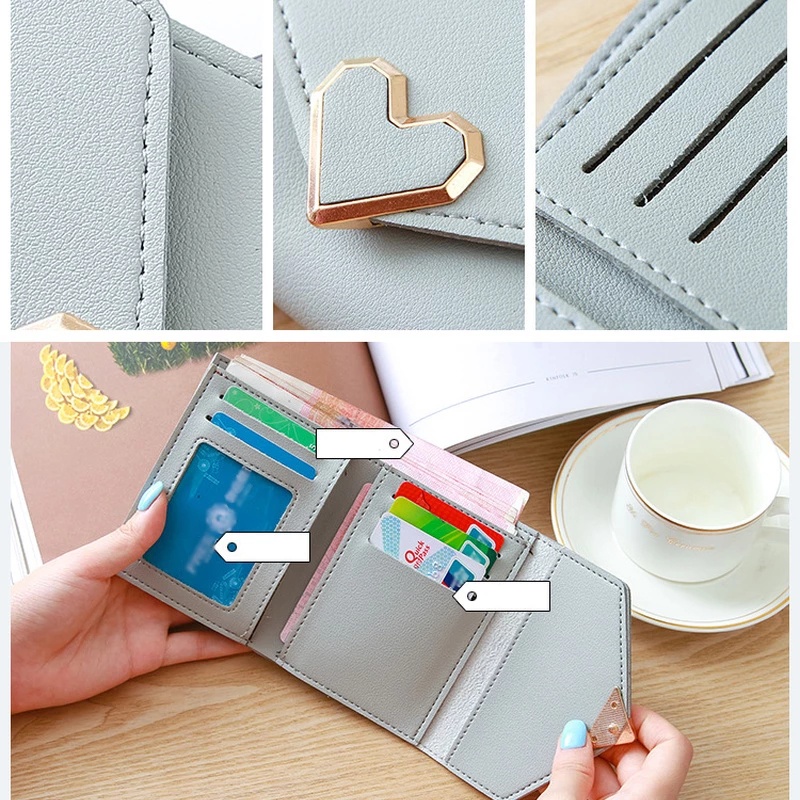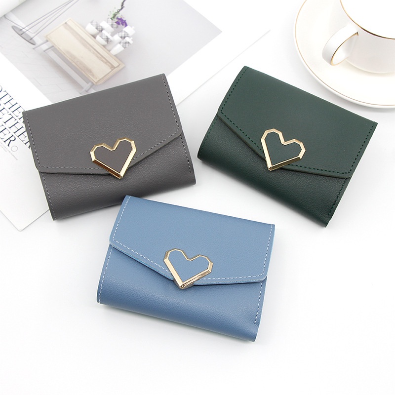 Korean Style Women's Short Wallet PU Leather Wallet Fashion PU Small Wallet Portable Women's Simple Wallet Cute Heart Folding Wallet With Metal Buckle Premium Tri-fold Clutch
