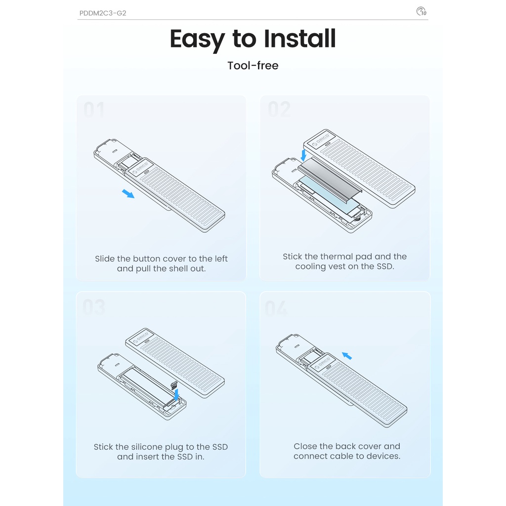 ORICO M.2 NVMe SSD Enclosure 10Gbps USB 3.2 Gen2 M2 SSD Enclosure Case Box Simple Design for NVMe SATA Tool-free Support UASP(PDDM2C3)