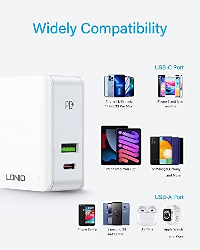 【Charge 2 Devices Simultaneously】This USB C wall charger can deliver up to 32W in total. Get both a USB-C PD port(20W Max) and USB-A port(12W Max), which are designed to fuel both smartphones, tablets, or other accessories simultaneously, and it also helps save precious space in your travel bag.