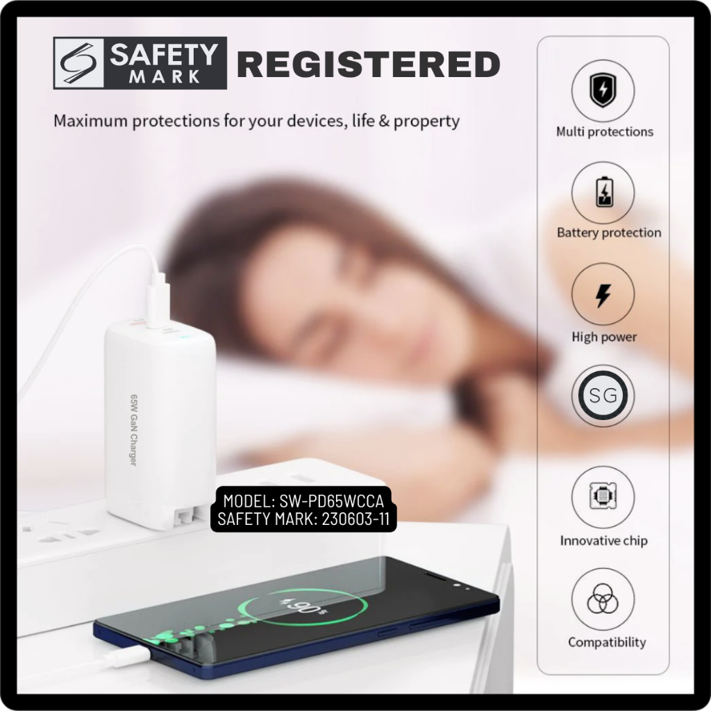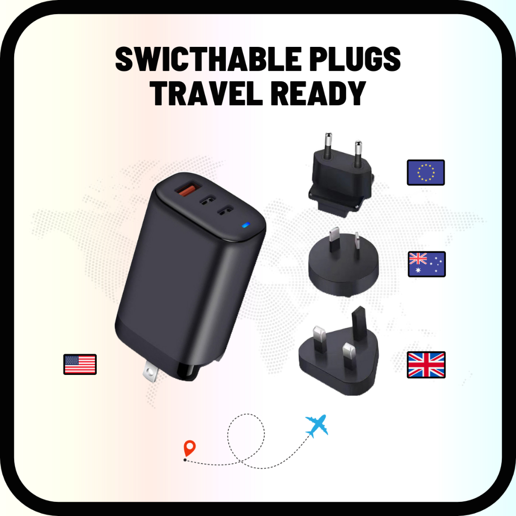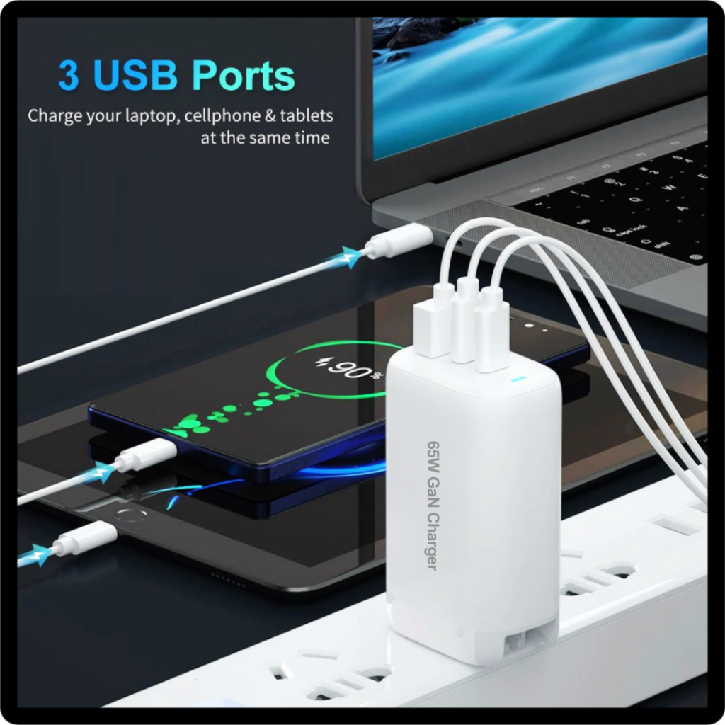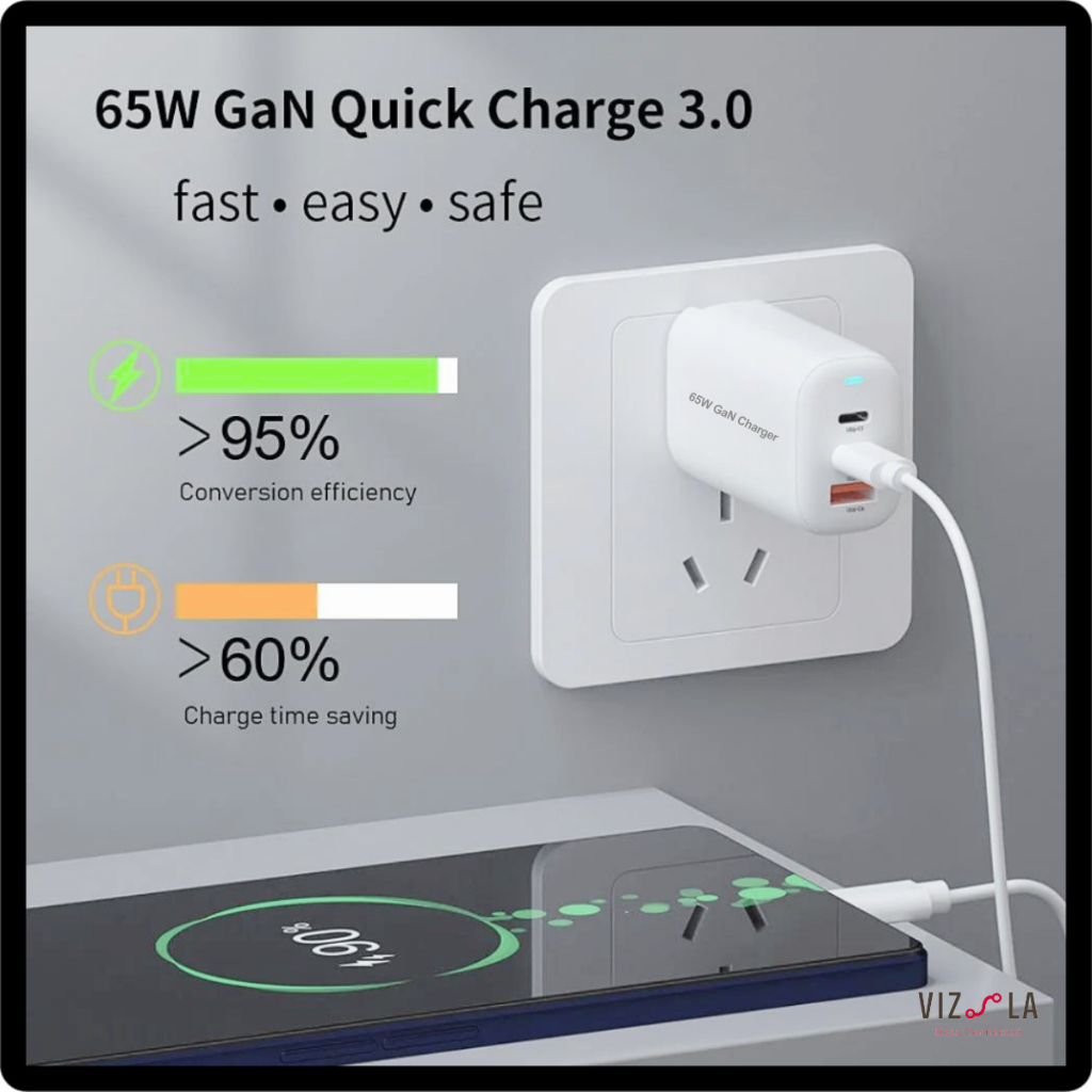 Vizsla SG 65W GaN USB Travel Charger 3-Ports FAST CHARGE 2TYPE-C 1USB-A SMART CHIP